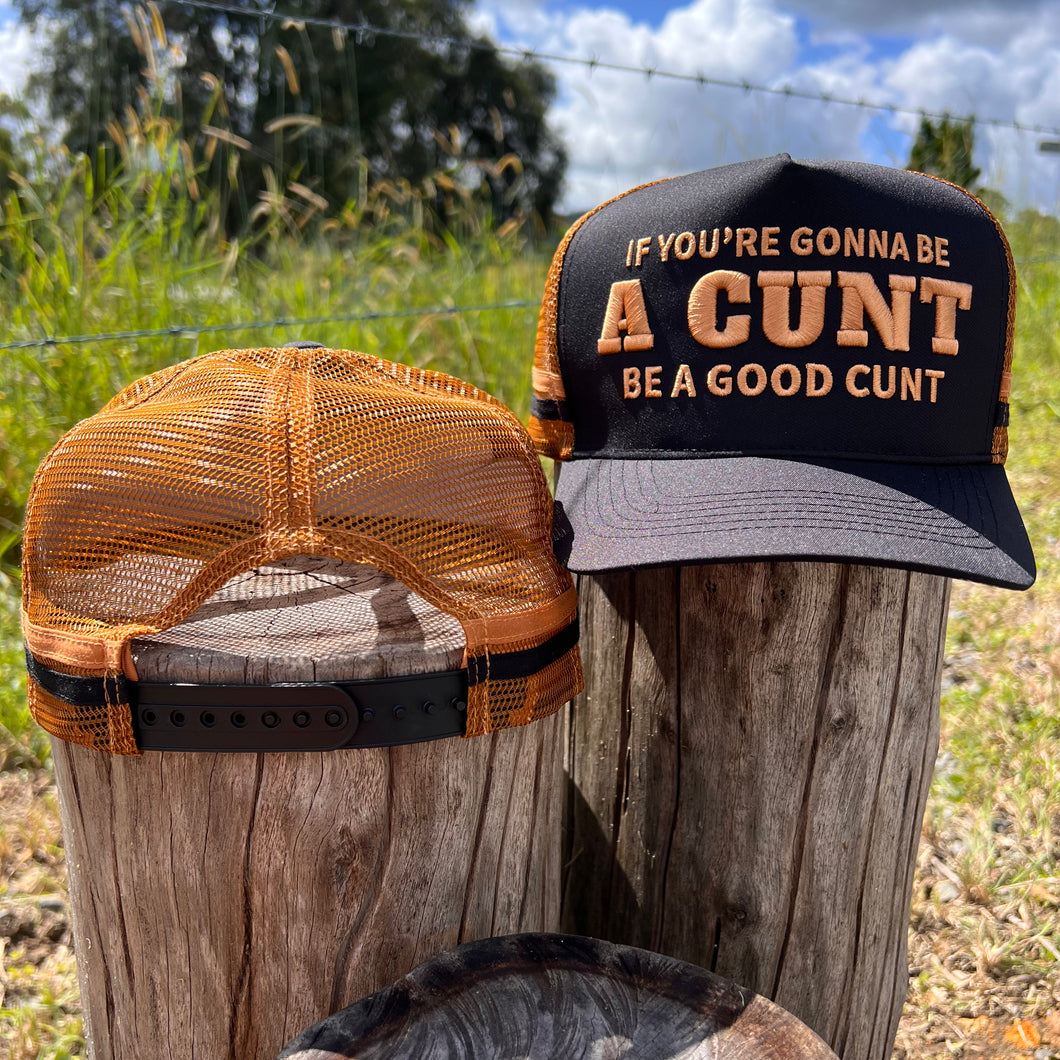 Get ready to turn heads with our Good Cunt Trucker Cap. This black cap features a tan embroidered logo that reads "IF YOU'RE GONNA BE A CUNT BE A GOOD CUNT." Perfect for those who love to have a good laugh and don't take themselves too seriously. Own your unique style with this playful and quirky cap.